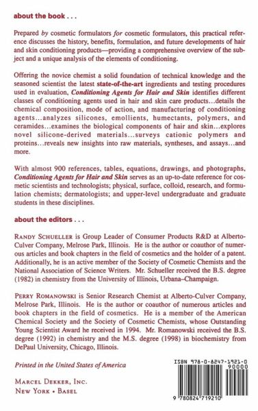"Introduction to Conditioning Agents for Hair and Skin Randy Schueller and Perry Romanowski Biology of the Hair and Skin Zoe Diana Draelos The Role of Biological Lipids in Skin Conditioning Peter M. Elias Petrolatum: Conditioning Through Occlusion David S. Morrison Humectants in Personal Care Formulation: A Practical Guide Bruce W. Gesslein Emollient Esters and Oils John Carson and Kevin Gallagher Proteins for Conditioning Hair and Skin Gary A. Neudahl Organo-Modified Siloxane Polymers for Conditioning Skin and Hair Eric S. Abrutyn Specialty Silicone Conditioning Agents Anthony J. O'Lenick Jr. Cationic Surfactants and Quaternary Derivatives for Hair and Skin Care Matthew F. Jurcyzk David T. Floyd and Burghard H. Gruning Polymers as Conditioning Agents for Hair and Skin Bernard Idson Formulating Conditioning Products for Hair and Skin Mort Westman Evaluating Effects of Conditioning Formulations on Hair Janusz Jachowicz Evaluating Performance Benefits of Conditioning Formulations on Human Skin Ronald L. Rizer Monya L. Sigler and David L. Miller "