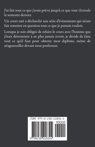 J'ai fait tout ce que j'avais prévu jusqu'à ce que tout s'écroule le semestre dernier. Un cours raté a déclenché une série d'événements qui m'ont fait remettre en question tout ce que je pensais vouloir. Lorsque je suis obligée de refaire le cours avec l'homme que j'étais déterminée à ne plus jamais revoir, je décide de faire tout ce qu'il faut pour obtenir mon diplôme, même de m'agenouiller devant mon professeur.