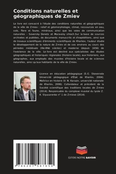 Le livre est consacré à l'étude des conditions naturelles et géographiques de la ville de Zmiev : relief et géomorphologie, climat, ressources en eau, sols, flore et faune, minéraux, ainsi que les voies de communication naturelles - Seversky Donets et Muravsky shlach.Sur la base de sources archivées et publiées, de documents manuscrits et d'expéditions, ainsi que de travaux scientifiques d'éminents scientifiques de Kharkov, l'auteur étudie le développement de la nature de Zmiev et de ses environs au cours des périodes médiévale (XIe-XIVe siècles) et moderne (depuis 1656) de l'existence de la ville. Le livre est destiné aux spécialistes des études géographiques et historiques régionales (histoire locale), aux historiens, aux géographes, aux employés des musées d'histoire locale et de sciences naturelles, ainsi qu'aux habitants de la ville de Zmiev.