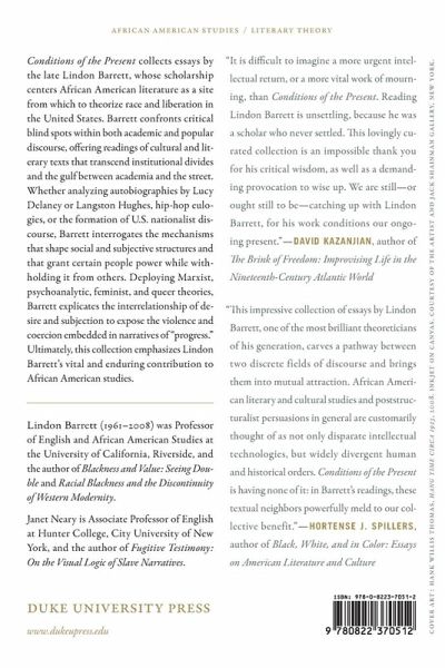 Conditions of the Present collects essays by the late Lindon Barrett, whose scholarship centers African American literature as a site from which to theorize race and liberation in the United States. Barrett confronts critical blind spots within both academic and popular discourse, offering readings of cultural and literary texts that transcend institutional divides and the gulf between academia and the street. Whether analyzing autobiographies by Lucy Delaney or Langston Hughes, hip-hop eulogies, or the formation of U.S. nationalist discourse, Barrett interrogates the mechanisms that shape social and subjective structures and that grant certain people power while withholding it from others. Deploying Marxist, psychoanalytic, feminist, and queer theories, Barrett explicates the interrelationship of desire and subjection to expose the violence and coercion embedded in narratives of "progress." Ultimately, this collection emphasizes Lindon Barrett's vital and enduring contribution to African American studies. Contributors. Elizabeth Alexander, Jennifer DeVere Brody, Daphne A. Brooks, Linh U. Hua, Janet Neary, Marlon B. Ross, Robyn Wiegman