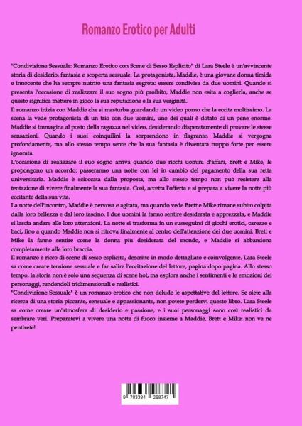 "Condivisione Sessuale: Romanzo Erotico con Scene di Sesso Esplicito" di Lara Steele è un'avvincente storia di desiderio, fantasia e scoperta sessuale. La protagonista, Maddie, è una giovane donna timida e innocente che ha sempre nutrito una fantasia segreta: essere condivisa da due uomini. Quando si presenta l'occasione di realizzare il suo sogno più proibito, Maddie non esita a coglierla, anche se questo significa mettere in gioco la sua reputazione e la sua verginità.Il romanzo inizia con Maddie che si masturba guardando un video porno che la eccita moltissimo. La scena la vede protagonista di un trio con due uomini, uno dei quali è dotato di un pene enorme. Maddie si immagina al posto della ragazza nel video, desiderando disperatamente di provare le stesse sensazioni. Quando i suoi coinquilini la sorprendono in flagrante, Maddie si vergogna profondamente, ma allo stesso tempo sente che la sua fantasia è diventata troppo forte per essere ignorata.L'occasione di realizzare il suo sogno arriva quando due ricchi uomini d'affari, Brett e Mike, le propongono un accordo: passeranno una notte con lei in cambio del pagamento della sua retta universitaria. Maddie è scioccata dalla proposta, ma allo stesso tempo non può resistere alla tentazione di vivere finalmente la sua fantasia. Così, accetta l'offerta e si prepara a vivere la notte più eccitante della sua vita.La notte dell'incontro, Maddie è nervosa e agitata, ma quando vede Brett e Mike rimane subito colpita dalla loro bellezza e dal loro fascino. I due uomini la fanno sentire desiderata e apprezzata, e Maddie si lascia andare alle loro attenzioni. La notte si trasforma in un susseguirsi di giochi erotici, carezze e baci, fino a quando Maddie non si ritrova finalmente al centro dell'attenzione dei due uomini. Brett e Mike la fanno sentire come la donna più desiderata del mondo, e Maddie si abbandona completamente alle loro braccia.Il romanzo è ricco di scene di sesso esplicito, descritte in modo dettagliato e coinvolgente. Lara Steele sa come creare tensione sessuale e far salire l'eccitazione del lettore, pagina dopo pagina. Allo stesso tempo, la storia non è solo una sequenza di scene hot, ma esplora anche i sentimenti e le emozioni dei personaggi, rendendoli tridimensionali e realistici."Condivisione Sessuale" è un romanzo erotico che non delude le aspettative del lettore. Se siete alla ricerca di una storia piccante, sensuale e appassionante, non potete perdervi questo libro. Lara Steele sa come creare un'atmosfera di desiderio e passione, e i suoi personaggi sono così realistici da sembrare veri. Preparatevi a vivere una notte di fuoco insieme a Maddie, Brett e Mike: non ve ne pentirete!