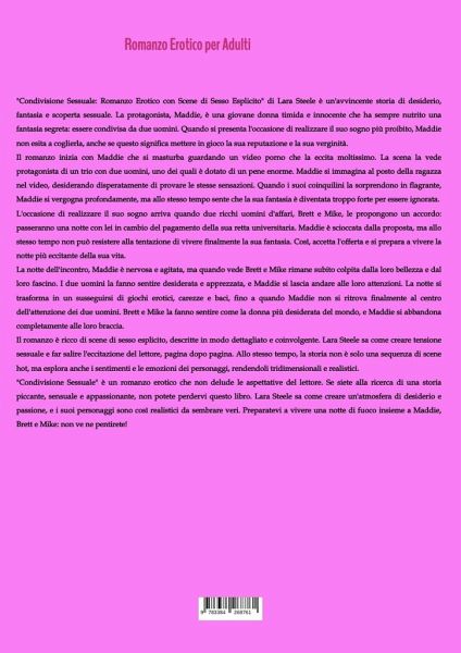 "Condivisione Sessuale: Romanzo Erotico con Scene di Sesso Esplicito" di Lara Steele è un'avvincente storia di desiderio, fantasia e scoperta sessuale. La protagonista, Maddie, è una giovane donna timida e innocente che ha sempre nutrito una fantasia segreta: essere condivisa da due uomini. Quando si presenta l'occasione di realizzare il suo sogno più proibito, Maddie non esita a coglierla, anche se questo significa mettere in gioco la sua reputazione e la sua verginità.Il romanzo inizia con Maddie che si masturba guardando un video porno che la eccita moltissimo. La scena la vede protagonista di un trio con due uomini, uno dei quali è dotato di un pene enorme. Maddie si immagina al posto della ragazza nel video, desiderando disperatamente di provare le stesse sensazioni. Quando i suoi coinquilini la sorprendono in flagrante, Maddie si vergogna profondamente, ma allo stesso tempo sente che la sua fantasia è diventata troppo forte per essere ignorata.L'occasione di realizzare il suo sogno arriva quando due ricchi uomini d'affari, Brett e Mike, le propongono un accordo: passeranno una notte con lei in cambio del pagamento della sua retta universitaria. Maddie è scioccata dalla proposta, ma allo stesso tempo non può resistere alla tentazione di vivere finalmente la sua fantasia. Così, accetta l'offerta e si prepara a vivere la notte più eccitante della sua vita.La notte dell'incontro, Maddie è nervosa e agitata, ma quando vede Brett e Mike rimane subito colpita dalla loro bellezza e dal loro fascino. I due uomini la fanno sentire desiderata e apprezzata, e Maddie si lascia andare alle loro attenzioni. La notte si trasforma in un susseguirsi di giochi erotici, carezze e baci, fino a quando Maddie non si ritrova finalmente al centro dell'attenzione dei due uomini. Brett e Mike la fanno sentire come la donna più desiderata del mondo, e Maddie si abbandona completamente alle loro braccia.Il romanzo è ricco di scene di sesso esplicito, descritte in modo dettagliato e coinvolgente. Lara Steele sa come creare tensione sessuale e far salire l'eccitazione del lettore, pagina dopo pagina. Allo stesso tempo, la storia non è solo una sequenza di scene hot, ma esplora anche i sentimenti e le emozioni dei personaggi, rendendoli tridimensionali e realistici."Condivisione Sessuale" è un romanzo erotico che non delude le aspettative del lettore. Se siete alla ricerca di una storia piccante, sensuale e appassionante, non potete perdervi questo libro. Lara Steele sa come creare un'atmosfera di desiderio e passione, e i suoi personaggi sono così realistici da sembrare veri. Preparatevi a vivere una notte di fuoco insieme a Maddie, Brett e Mike: non ve ne pentirete!