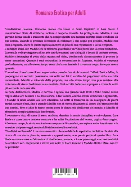 "Condivisione Sessuale: Romanzo Erotico con Scene di Sesso Esplicito" di Lara Steele è un'avvincente storia di desiderio, fantasia e scoperta sessuale. La protagonista, Maddie, è una giovane donna timida e innocente che ha sempre nutrito una fantasia segreta: essere condivisa da due uomini. Quando si presenta l'occasione di realizzare il suo sogno più proibito, Maddie non esita a coglierla, anche se questo significa mettere in gioco la sua reputazione e la sua verginità.Il romanzo inizia con Maddie che si masturba guardando un video porno che la eccita moltissimo. La scena la vede protagonista di un trio con due uomini, uno dei quali è dotato di un pene enorme. Maddie si immagina al posto della ragazza nel video, desiderando disperatamente di provare le stesse sensazioni. Quando i suoi coinquilini la sorprendono in flagrante, Maddie si vergogna profondamente, ma allo stesso tempo sente che la sua fantasia è diventata troppo forte per essere ignorata.L'occasione di realizzare il suo sogno arriva quando due ricchi uomini d'affari, Brett e Mike, le propongono un accordo: passeranno una notte con lei in cambio del pagamento della sua retta universitaria. Maddie è scioccata dalla proposta, ma allo stesso tempo non può resistere alla tentazione di vivere finalmente la sua fantasia. Così, accetta l'offerta e si prepara a vivere la notte più eccitante della sua vita.La notte dell'incontro, Maddie è nervosa e agitata, ma quando vede Brett e Mike rimane subito colpita dalla loro bellezza e dal loro fascino. I due uomini la fanno sentire desiderata e apprezzata, e Maddie si lascia andare alle loro attenzioni. La notte si trasforma in un susseguirsi di giochi erotici, carezze e baci, fino a quando Maddie non si ritrova finalmente al centro dell'attenzione dei due uomini. Brett e Mike la fanno sentire come la donna più desiderata del mondo, e Maddie si abbandona completamente alle loro braccia.Il romanzo è ricco di scene di sesso esplicito, descritte in modo dettagliato e coinvolgente. Lara Steele sa come creare tensione sessuale e far salire l'eccitazione del lettore, pagina dopo pagina. Allo stesso tempo, la storia non è solo una sequenza di scene hot, ma esplora anche i sentimenti e le emozioni dei personaggi, rendendoli tridimensionali e realistici."Condivisione Sessuale" è un romanzo erotico che non delude le aspettative del lettore. Se siete alla ricerca di una storia piccante, sensuale e appassionante, non potete perdervi questo libro. Lara Steele sa come creare un'atmosfera di desiderio e passione, e i suoi personaggi sono così realistici da sembrare veri. Preparatevi a vivere una notte di fuoco insieme a Maddie, Brett e Mike: non ve ne pentirete!