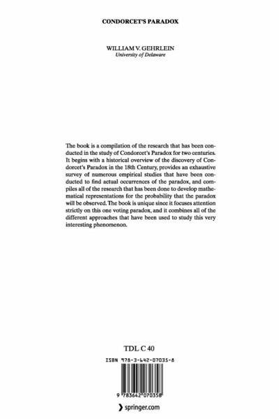 Condorcet's Paradox has been formally studied by an amazing number of people in many different contexts for more than two centuries. Peter Fishburn introduced the basic notion of the Paradox to me in 1971 during a course in Social Choice Theory at Pennsylvania State University. My immediate response to seeing the simple example that he presented was that this phenomenon certainly could not be very likely to ever be observed in reality. Peter quickly suggested that I should work on developing some representations for the probability that the Paradox might occur, and very soon thereafter that pursuit began. It is only after 35 years of effort, with a lot of help from Peter, that I now feel that a good answer can be given to the challenge that was presented in that classroom in 1971. Many people have suggested to me over the years that a book like this should be completed, since the source material is spread over such a wide variety of disciplines of a- demic journals and books thatit is very difficult for people to know what has been done, and has not been done, in this area of determining representations for the probability that Condorcet's Paradox would ever be observed in reality.