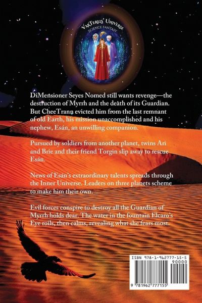 DiMensioner Seyes Nomed still wants revenge-the destruction of Myrrh and the death of its Guardian. But he's been evicted from the last remnant of old Earth, his mission unaccomplished and his nephew, Esán, an unwilling companion. Pursued by soldiers from another planet, twins Ari and Brie and their friend Torgin slip away to rescue Esán. News of Esán's extraordinary talents spreads through the Inner. Leaders on three planets scheme to make him their own. Evil forces conspire to destroy all the Guardian of Myrrh holds dear. The water the fountain Elcaro's Eye roils, then calms, revealing what she fears most.
