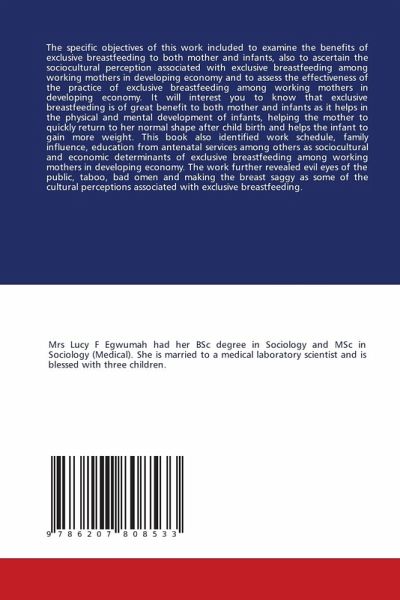 The specific objectives of this work included to examine the benefits of exclusive breastfeeding to both mother and infants, also to ascertain the sociocultural perception associated with exclusive breastfeeding among working mothers in developing economy and to assess the effectiveness of the practice of exclusive breastfeeding among working mothers in developing economy. It will interest you to know that exclusive breastfeeding is of great benefit to both mother and infants as it helps in the physical and mental development of infants, helping the mother to quickly return to her normal shape after child birth and helps the infant to gain more weight. This book also identified work schedule, family influence, education from antenatal services among others as sociocultural and economic determinants of exclusive breastfeeding among working mothers in developing economy. The work further revealed evil eyes of the public, taboo, bad omen and making the breast saggy as some of the cultural perceptions associated with exclusive breastfeeding.