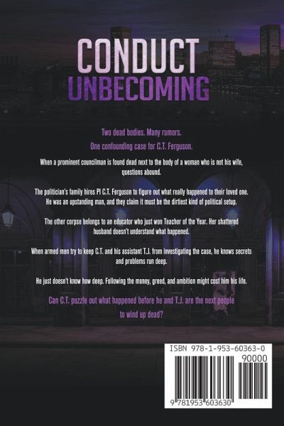 Two dead bodies. Many rumors. One confounding case for C.T. Ferguson. When a prominent Baltimore County councilman is found dead next to the body of a woman who is not his wife, questions abound. The politician's family hires private investigator C.T. Ferguson to figure out what really happened. He was an upstanding man, and they claim it must be the dirtiest kind of political setup. The other corpse belongs to an educator who just won Teacher of the Year. Her shattered husband doesn't understand what happened. When armed men try to keep C.T. and his assistant T.J. from investigating the case, he knows secrets and problems run deep. He just doesn't know how deep. Finding out might cost him his life. Can C.T. puzzle out what happened before he and T.J. are the next people to wind up dead? Conduct Unbecoming is the 15th gripping novel in the C.T. Ferguson crime fiction series. Each story stands alone, so you can enjoy the books in whatever order you find them.