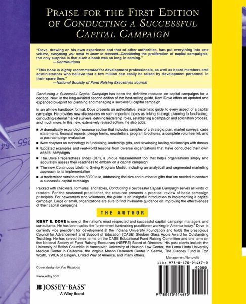 Praise for the First Edition of Conducting a Successful Capital Campaign "This book is highly recommended for development professionals, as well as board members and administrators who believe that a few million can easily be raised by development personnel in their spare time." -National Society of Fund Raising Executives Journal "Dove, drawing on his own experience and that of other authorities, has put everything into one volume, everything you need to know to succeed.... Considering the proliferation of capital campaigns, the only surprise is that such a book was so long in coming." -Contributions Conducting a Successful Capital Campaign has been the definitive resource on capital campaigns for a decade. Now, in the long-awaited second edition of the best-selling guide, Kent Dove offers an updated and expanded blueprint for planning and managing a successful capital campaign. In an all-new handbook format, Dove presents an authoritative, systematic guide to every aspect of a capital campaign. He provides new discussions on such important topics as linking strategic planning to fundraising, conducting external market surveys, defining leadership roles, establishing a campaign and solicitation process, and much more. In this new, extensively revised edition, he also adds: * A dramatically expanded resource section that includes samples of a strategic plan, market surveys, case statements, financial reports, pledge forms, newsletters, program brochures, a complete volunteer kit, and a post-campaign evaluation * New chapters on technology in fundraising, leadership gifts, and developing lasting relationships with donors * Updated examples and real-world lessons from diverse organizations that have conducted their own capital campaigns * The Dove Preparedness Index (DPI), a unique measurement tool that helps organizations simply and accurately assess their readiness to embark on a capital campaign * The new Continuous Lifetime Giving Program Model, including an analytical and segmented marketing approach to its implementation * A modernized version of the 80/20 rule, addressing the size and number of gifts that are needed to conduct a successful capital campaign Packed with checklists, formulas, and tables, Conducting a Successful Capital Campaign serves all kinds of readers. For the seasoned practitioner, the resource presents a practical review of basic campaign principles. For newcomers and volunteers, the guide is an insightful introduction to implementing a capital campaign. Large or small, organizations are sure to find invaluable guidance on improving the effectiveness of their capital campaigns.