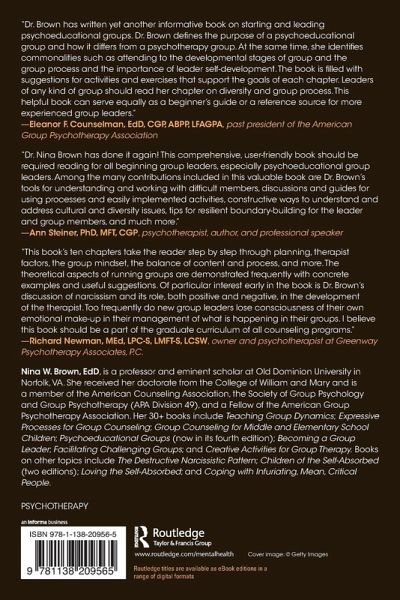 Nina W. Brown, EdD, is a professor and eminent scholar at Old Dominion University in Norfolk, VA. She received her doctorate from the College of William and Mary and is a member of the American Counseling Association, the Society of Group Psychology and Group Psychotherapy (APA Division 49), and a Fellow of the American Group Psychotherapy Association. Her 30+ books include Teaching Group Dynamics; Expressive Processes for Group Counseling ; Group Counseling for Middle and Elementary School Children; Psychoeducational Groups (now in its fourth edition); Becoming a Group Leader; Facilitating Challenging Groups; and Creative Activities for Group Therapy. Books on other topics include The Destructive Narcissistic Pattern ; Children of the Self-Absorbed (two editions); Loving the Self-Absorbed; and Coping with Infuriating, Mean, Critical People.