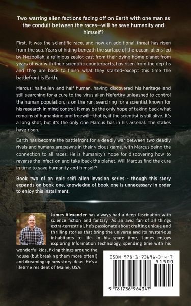 Two warring alien factions facing off on Earth with one man as the conduit between the races-will he save humanity and himself? First, it was the scientific race, and now an additional threat has risen from the sea. Years of hiding beneath the surface of the ocean, aliens led by Nezbollah, a religious zealot cast from their dying home planet from years of war with their scientific counterparts, has risen from the depths and they are back to finish what they started-except this time the battlefront is Earth. Marcus, half-alien and half human, having discovered his heritage and still searching for a cure to the virus alien Nefertiry unleashed to control the human population, is on the run; searching for a scientist known for his research in mind control. It may be the only hope of taking back what remains of humankind and freewill-that is, if the scientist is still alive. It's a long shot, but it's the only one Marcus has in his arsenal. The stakes have risen. Earth has become the battlefront for a deadly war between two deadly rivals and humans are pawns in their vicious game, with Marcus being the connection to all races. He is humanity's hope for discovering how to reverse the infection and take back the planet. Will Marcus find the cure in time to save humanity and himself? Book two of an epic scifi alien invasion series - though this story expands on book one, knowledge of book one is unnecessary in order to enjoy this installment.