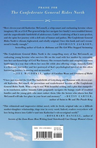 In this richly imagined, utterly original debut, a mother-daughter road trip leads a young girl, a precocious Civil War buff, to a hard-won understanding of the American history she loves and the personal history she inherits. Eleven-year-old Katherine McConnell is so immersed in Civil War history that she often imagines herself a general, leading troops to battle. When Kat’s beautiful, impulsive mother wakes her early one morning in the summer of 1968 to tell her they will be taking a road trip from Georgia to Maine to find antiques for a shop she wants to open, Kat sees the opportunity for adventure and a respite from her parents’ troubled marriage. Armed with a road atlas and her most treasured history books, Kat cleverly charts a course that will take them to battlefields and historic sites and, for her mother’s sake she hopes, bring them home a success. But as the trip progresses, Kat’s experiences test her faith in her mother and her loyalty to the South, bringing her to a difficult new awareness of her family and the history she reveres. And when their journey comes to an abrupt and devastating halt in Gettysburg, Kat must make an irrevocable choice about their ultimate destination. Deftly narrated with the beguiling honesty of a child’s perspective and set against the rich backdrop of the South during the 1960s, The Confederate General Rides North gracefully blends a complex mother-daughter relationship, the legacy of the Civil War, and the ache of growing up too soon.