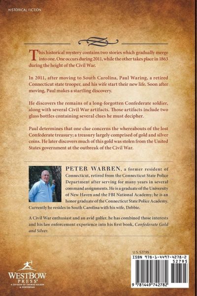 This historical mystery contains two stories which gradually merge into one. One occurs during 2011, while the other takes place in 1863 during the height of the Civil War. In 2011, after moving to South Carolina, Paul Waring, a retired Connecticut state trooper, and his wife start their new life. Soon after moving, Paul makes a startling discovery. He discovers the remains of a long-forgotten Confederate soldier, along with several Civil War artifacts. Those artifacts include two glass bottles containing several clues he must decipher. Paul determines that one clue concerns the whereabouts of the lost Confederate treasury; a treasury largely comprised of gold and silver coins. He later discovers much of this gold was stolen from the United States government at the outbreak of the Civil War.