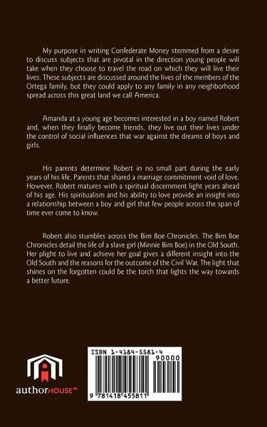 My purpose in writing Confederate Money stemmed from a desire to discuss subjects that are pivotal in the direction young people will take when they choose to travel the road on which they will live their lives. These subjects are discussed around the lives of the members of the Ortega family, but they could apply to any family in any neighborhood spread across this great land we call America. Amanda at a young age becomes interested in a boy named Robert and, when they finally become friends, they live their lives out under the control of societal influences that war against the dreams of boys and girls. Robert, who in no small part becomes determined by his parents that share a marriage commitment void of love, matures with a spiritual discernment light years ahead of his age. His spiritualism and his ability to love provide an insight into a relationship between a boy and girl that few people, across the entire span of time, ever come to know. Robert also stumbles across the Bim Boo Chronicles. The Bim Boo Chronicles detail the life of a slave girl (Minnie Bim Boo) in the Old South. Her plight to live and achieve her goal provide an insight into the Old South and the reasons why the Civil War was fought that have never been looked at before. The truth that is espoused in the Bim Boo Chronicles may be the last vestige of hope for those who are still shackled with hatred.