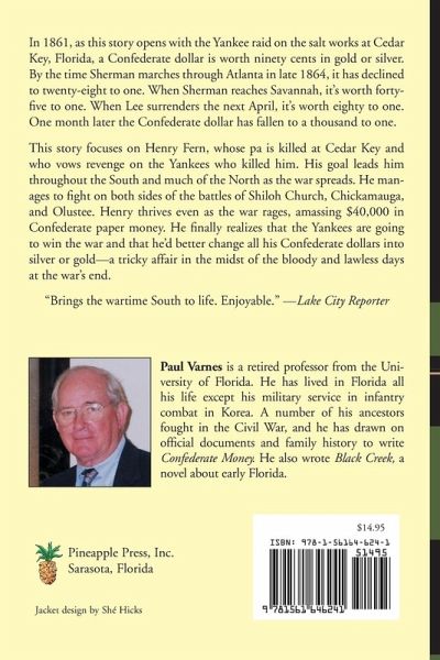 In 1861, as this story opens with the Yankee raid on the salt works at Cedar Key, Florida, a Confederate dollar is worth 90 cents in gold or silver. The Yankee soldiers, in their zeal to destroy the important Confederate salt works, kill young Henry Ferns step-pa, who has brought Henry to the Gulf Coast town on his first train ride. From that moment on, Henry's mind is locked on revenge. His goal to find the Yankee killers leads him throughout the South and much of the North as the war spreads. He studies medicine and offers aid to whichever side he needs to move through at the time. Through shrewd dealings he manages to amass $40,000 in Confederate paper money. Henry realizes that the Yankees are going to win the war or, at best, the South will end it a draw. In either case, the Confederate money will not be worth as much as silver or gold, so he sets out to change it into specie. Henery's adventures take him into both sides of the Battles of Shiloh Church, Chickamauga, and Olustee. With his charismatic personality and keen judgment, Henry manages to thrive even as the war rages, persisting in changing his paper fortune into silver and gold. He is as generous with his family, friends, and those he perceives to be in need as he is ruthless with those he knows to be his enemies. By the time Sherman marches through Atlanta in late 1864, the Confederate dollar has declined to 28 for one in silver or gold. When Sherman reaches Savannah, its worth is 45 to one. When Lee surrenders the next April, its worth is 80 to one. One month later it has fallen to 1,000 to one. Shortly after this, Henry undertakes a daring raid on the hidden Confederate treasury to bring him to his financial goal.