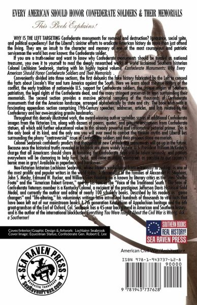 Why is the Left targeting Confederate monuments for removal and destruction? Ignorance, social spite, and political expediency! But the Liberal's sinister efforts to eradicate American history do more than just offend the living. They are an insult to the character and memory of one of the most courageous and patriotic serviceman the world has ever known: the Confederate soldier. If you are a truth-seeker and want to know why Confederate monuments should be treated as national treasures, you owe it to yourself to read the deeply researched works of world acclaimed Southern historian Colonel Lochlainn Seabrook, starting with his highly topical volume, Confederate Monuments: Why Every American Should Honor Confederate Soldiers and Their Memorials. Conveniently divided into three sections, the first debunks the fake history fabricated by the Left to conceal the facts about Lincoln's War and turn America against the South. Here we learn about the true history of the conflict, the early tradition of nationwide U.S. support for Confederate soldiers, the unique origins of Southern patriotism, the legal rights of the Confederate dead, and the many stringent preservation laws surrounding their memorials. The second section provides a massive pictorial sampling of the thousands of Confederate monuments that dot the American landscape, arranged alphabetically by state and city. The book ends with a fascinating appendices section comprising 19th-Century speeches, addresses, articles, and lists related to the Confederacy and her awe-inspiring granite landmarks. Throughout this densely illustrated work, the award-winning author sprinkles scores of additional Confederate images from the Victorian Era, along with dozens of poems, quotes, and genuine inscriptions from Confederate statues, all which add further educational value to this already powerful and informative pictorial primer. This is the only book of its kind, and the only one you will ever need to combat the Yankee myths and Liberal lies surrounding the phony "controversial" issue of Confederate soldiers and their precious stone memorials. Colonel Seabrook confidently predicts that thousands of new Confederate monuments will go up in the future. Because once the historical truths revealed in his book are more widely known, U.S. President William McKinley's charge that all Americans should share in honoring the Confederate dead will be taken seriously, and patriots everywhere will be clamoring to help fund, build, and raise as many memorials as possible to our country's heroic men in gray! Confederate Monuments is available in paperback and hardcover. Neo-Victorian historian Lochlainn Seabrook, whose literary works range from astronomy to zoology, is one of the most prolific and popular writers in the world today. A descendant of the families of Alexander H. Stephens, John S. Mosby, Edmund W. Rucker, and William Giles Harding, he is known by literary critics as the "new Shelby Foote" and the "American Robert Graves," and by his fans as the "Voice of the Traditional South." The Sons of Confederate Veterans member is a Kentucky Colonel, a recipient of the prestigious Jefferson Davis Historical Gold Medal, and the author and editor of nearly 100 scholarly books (currently). Described by his readers as "game changers" and "life-altering," his voluminous writings have introduced hundreds of thousands to vital facts that have been left out of our mainstream books. A 7th generation Kentuckian of Appalachian heritage and the 6th great-grandson of the Earl of Oxford, Col. Seabrook has a 45-year background in American and Southern history, and is the author of the international blockbuster Everything You Were Taught About the Civil War is Wrong, Ask a Southerner!