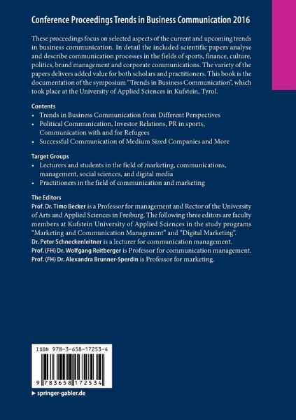 These proceedings focus on selected aspects of the current and upcoming trends in business communication. In detail the included scientific papers analyse and describe communication processes in the fields of sports, finance, culture, politics, brand management and corporate communications. The variety of the papers delivers added value for both scholars and practitioners. This book is the documentation of the symposium "Trends in Business Communication", which took place at the University of Applied Sciences in Kufstein, Tyrol.