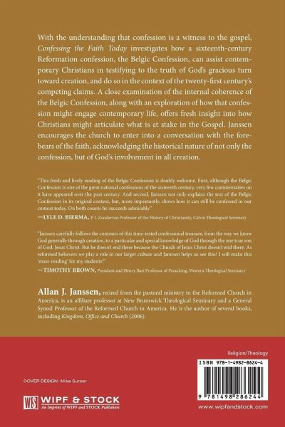 With the understanding that confession is a witness to the gospel, Confessing the Faith Today investigates how a sixteenth-century Reformation confession, the Belgic Confession, can assist contemporary Christians testify to the truth of Gods gracious turn toward creation and do so in the context of the twenty-first century's competing claims. A close examination of the internal coherence of the Belgic Confession, along with an exploration of how that confession might engage contemporary life, offers fresh insight into how Christians might articulate what is at stake in the gospel. Janssen encourages the church to enter a conversation with the forebears of the faith, acknowledging the historical nature of not only the confession but of God's involvement in all creation.