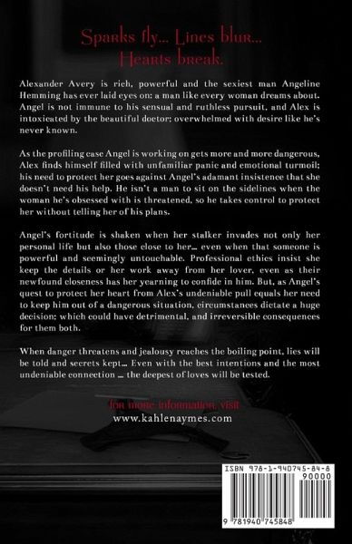 Sparks Fly ... Lines Blur... and Hearts Break Alexander Avery is rich, powerful and the sexiest man Angeline Hemming has ever laid eyes on: a man like every woman dreams about. Angel is not immune to his sensual and ruthless pursuit, and Alex is intoxicated by the beautiful doctor; overwhelmed with desire like he's never known. As the profiling case Angel is working on gets more and more dangerous, Alex finds himself filled with unfamiliar panic and emotional turmoil; his need to protect her goes against Angel's adamant insistence that she doesn't need his help. He isn't a man to sit on the sidelines when the woman he's obsessed with is threatened, so he takes control to protect her without telling her of his plans. Angel's fortitude is shaken when her stalker invades not only her personal life but also those close to her... even when that someone is powerful and seemingly untouchable. Professional ethics insist she keep the details or her work away from her lover, even as their newfound closeness has her yearning to confide in him. But, as Angel's quest to protect her heart from Alex's undeniable pull equals her need to keep him out of a dangerous situation, circumstances dictate a huge decision; which could have detrimental, and irreversible consequences for them both. When danger threatens and jealousy reaches the boiling point, lies will be told and secrets kept... Even with the best intentions and the most undeniable connection ... the deepest of loves will be tested.