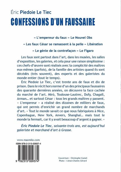 Les faux sont partout dans l'art, dans les musées, les salles d'exposition, les galeries, et cela pour une raison simplissime : ces chefs-d'uvre sont réalisés avec la complicité des maîtres eux-mêmes (parfois), de la famille des artistes quand ils sont décédés (très souvent), des experts et des galeristes du monde entier (tout le temps).Éric Piedoie Le Tiec, c'est trente ans de faux et dix de prison. Dans le récit hors norme d'un des principaux faussaires des quarante dernières années, on découvre la face cachée du marché de l'art. Miró, Toulouse-Lautrec, Dufy, Chagall, Arman... et surtout César : tous les grands maîtres y passent. L'empereur a réalisé des dizaines de milliers de faux, qui ont permis d'enrichir un grand nombre de marchands d'art. Tout le monde savait ce que nous fabriquions à Nice, Copenhague, New York, Anvers, Shanghaï... mais tout le monde la fermait, car il y avait beaucoup d'argent à gagner.