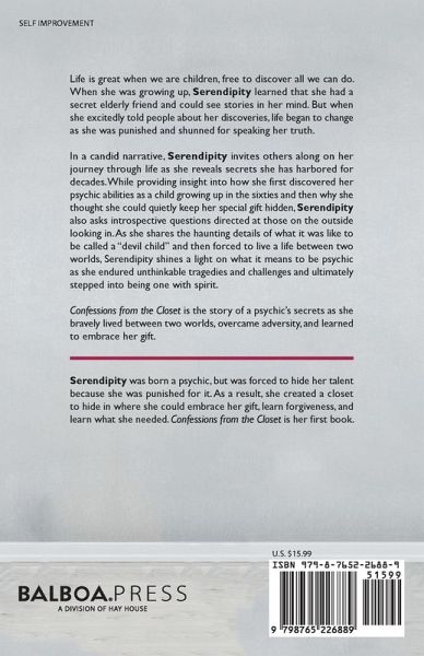 Life is great when we are children, free to discover all we can do. When she was growing up, Serendipity learned that she had a secret elderly friend and could see stories in her mind. But when she excitedly told people about her discoveries, life began to change as she was punished and shunned for speaking her truth. In a candid narrative, Serendipity invites others along on her journey through life as she reveals secrets she has harbored for decades. While providing insight into how she first discovered her psychic abilities as a child growing up in the sixties and then why she thought she could quietly keep her special gift hidden, Serendipity also asks introspective questions directed at those on the outside looking in. As she shares the haunting details of what it was like to be called a "devil child" and then forced to live a life between two worlds, Serendipity shines a light on what it means to be psychic as she endured unthinkable tragedies and challenges and ultimately stepped into being one with spirit. Confessions from the Closet is the story of a psychic's secrets as she bravely lived between two worlds, overcame adversity, and learned to embrace her gift.