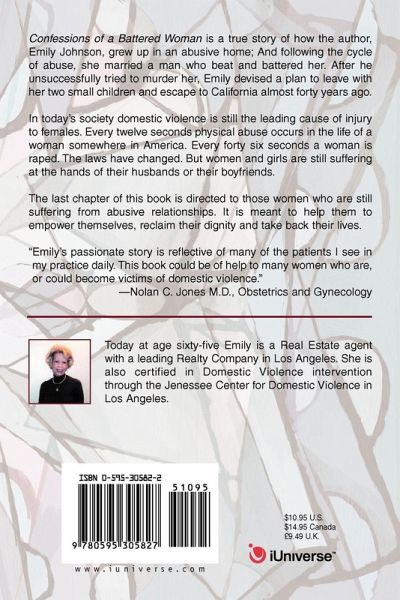 Confessions of a Battered Woman is a true story of how the author, Emily Johnson, grew up in an abusive home; And following the cycle of abuse, she married a man who beat and battered her. After he unsuccessfully tried to murder her, Emily devised a plan to leave with her two small children and escape to California almost forty years ago. In today's society domestic violence is still the leading cause of injury to females. Every twelve seconds physical abuse occurs in the life of a woman somewhere in America. Every forty six seconds a woman is raped. The laws have changed. But women and girls are still suffering at the hands of their husbands or their boyfriends. The last chapter of this book is directed to those women who are still suffering from abusive relationships. It is meant to help them to empower themselves, reclaim their dignity and take back their lives. "Emily's passionate story is reflective of many of the patients I see in my practice daily. This book could be of help to many women who are, or could become victims of domestic violence."--Nolan C. Jones M.D., Obstetrics and Gynecology