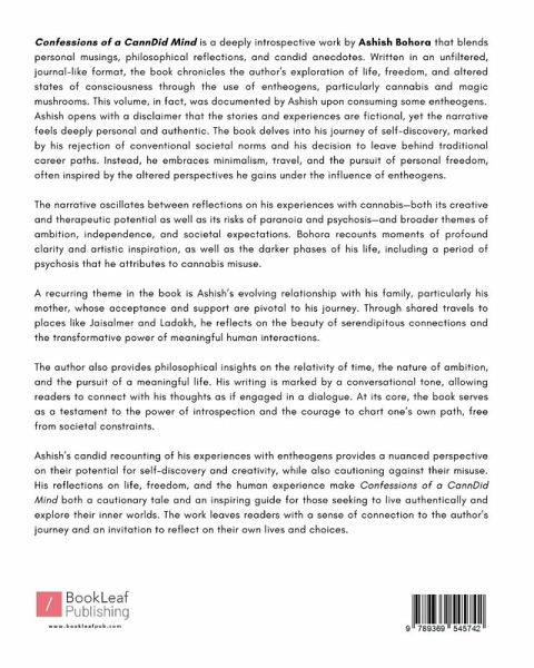 ""Confessions of a CannDid Mind is a deeply introspective work by Ashish Bohora that blends personal musings, philosophical reflections, and candid anecdotes. Written in an unfiltered, journal-like format, the book chronicles the author's exploration of life, freedom, and altered states of consciousness through the use of entheogens, particularly cannabis and magic mushrooms. This volume, in fact, was documented by Ashish upon consuming some entheogens. Ashish opens with a disclaimer that the stories and experiences are fictional, yet the narrative feels deeply personal and authentic. The book delves into his journey of self-discovery, marked by his rejection of conventional societal norms and his decision to leave behind traditional career paths. Instead, he embraces minimalism, travel, and the pursuit of personal freedom, often inspired by the altered perspectives he gains under the influence of entheogens. The narrative oscillates between reflections on his experiences with cannabis-both its creative and therapeutic potential as well as its risks of paranoia and psychosis-and broader themes of ambition, independence, and societal expectations. Bohora recounts moments of profound clarity and artistic inspiration, as well as the darker phases of his life, including a period of psychosis that he attributes to cannabis misuse. A recurring theme in the book is Ashish's evolving relationship with his family, particularly his mother, whose acceptance and support are pivotal to his journey. Through shared travels to places like Jaisalmer and Ladakh, he reflects on the beauty of serendipitous connections and the transformative power of meaningful human interactions. The author also provides philosophical insights on the relativity of time, the nature of ambition, and the pursuit of a meaningful life. His writing is marked by a conversational tone, allowing readers to connect with his thoughts as if engaged in a dialogue. At its core, the book serves as a testament to the power of introspection and the courage to chart one's own path, free from societal constraints. Ashish's candid recounting of his experiences with entheogens provides a nuanced perspective on their potential for self-discovery and creativity, while also cautioning against their misuse. His reflections on life, freedom, and the human experience make Confessions of a CannDid Mind both a cautionary tale and an inspiring guide for those seeking to live authentically and explore their inner worlds. The work leaves readers with a sense of connection to the author's journey and an invitation to reflect on their own lives and choices. ""