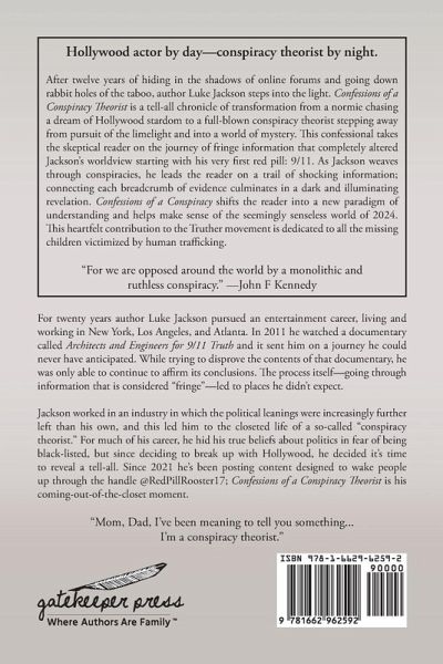 Hollywood actor by day-conspiracy theorist by night. After twelve years of hiding in the shadows of online forums and going down rabbit holes of the taboo, author Luke Jackson steps into the light. Confessions of a Conspiracy Theorist is a tell-all chronicle of transformation from a normie chasing a dream of Hollywood stardom to a full-blown conspiracy theorist stepping away from pursuit of the limelight and into a world of mystery. This confessional takes the skeptical reader on the journey of fringe information that completely altered Jackson's worldview starting with his very first red pill: 9/11. As Jackson weaves through conspiracies, he leads the reader on a trail of shocking information; connecting each breadcrumb of evidence culminates in a dark and illuminating revelation. Confessions of a Conspiracy shifts the reader into a new paradigm of understanding and helps make sense of the seemingly senseless world of 2024. This heartfelt contribution to the Truther movement is dedicated to all the missing children victimized by human trafficking. "For we are opposed around the world by a monolithic and ruthless conspiracy." -John F Kennedy