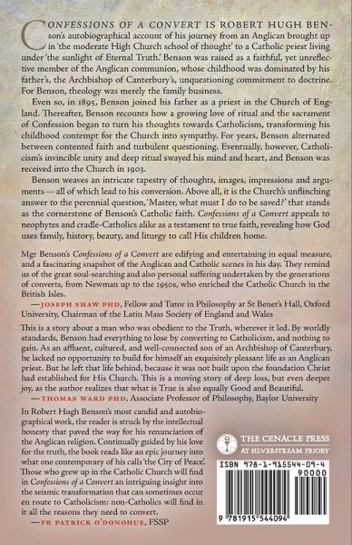 Confessions of a Convert is Robert Hugh Benson's autobiographical account of his journey from an Anglican brought up in "the moderate High Church school of thought" to a Catholic priest living under "the sunlight of Eternal Truth." Benson was raised as a faithful, yet unreflective member of the Anglican communion, whose childhood was dominated by his father's, the Archbishop of Canterbury's, unquestioning commitment to doctrine. Theology was merely the family business, and hints at a more personal relationship with God only arose with snatches of poetry or a fleetingly splendid line from a sermon. As the years progressed, however, Benson felt called to join his father in the priesthood, and he was ordained a priest in the Church of England in 1895. Benson recounts how his growing love of ritual and the sacrament of Confession first turned his thoughts towards Catholicism, transforming his childhood contempt for the Church into sympathy. These loves simultaneously planted doubts about the Anglican communion since he could nowhere find a unanimous interpretation of its doctrines. For years, Benson alternated between contented faith and turbulent questioning. Eventually, however, Catholicism's invincible unity and deep ritual swayed his mind and heart, and Benson was received into the Church in 1903. Benson weaves an intricate tapestry of thoughts, images, impressions and arguments-all of which lead to his conversion. Above all, it is the Church's unflinching and eternal answer to the perennial question, "Master, what must I do to be saved?" that stands as the cornerstone of Benson's Catholic faith. Confessions of a Convert appeals to neophytes and cradle-Catholics alike as a testament to true faith, revealing how God uses family, history, beauty, and liturgy to call His children home. Mgr Benson's 'Confessions of a Convert' are edifying and entertaining in equal measure, and a fascinating snapshot of the Anglican and Catholic scenes in his day. They remind us of the great soul-searching and also personal suffering undertaken by the generations of converts, from Newman up to the 1950s, who enriched the Catholic Church in the British Isles while the Church was subject to the soft persecution of prejudice and social exclusion.-Joseph Shaw PhD, Fellow and Tutor in Philosophy at St Benet's Hall, Oxford University, Chairman of the Latin Mass Society of England and Wales This is a story about a man who was obedient to the Truth, wherever it led. By worldly standards, Benson had everything to lose by converting to Catholicism, and nothing to gain. As an affluent, cultured, and well-connected son of an Archbishop of Canterbury, he lacked no opportunity to build for himself an exquisitely pleasant life as an Anglican priest. But he left that life behind, because it was not built upon the foundation Christ had established for His Church. This is a moving story of deep loss, but even deeper joy, as the author realizes that what is True is also equally Good and Beautiful. - Thomas Ward PhD, Associate Professor of Philosophy, Baylor University In Robert Hugh Benson's most candid and autobiographical work, the reader is struck by the intellectual honesty that paved the way for his renunciation of the Anglican religion. Continually guided by his love for the truth, the book reads like an epic journey into what one contemporary of his calls 'the City of Peace'. Those who grew up in the Catholic Church will find in Confessions of a Convert an intriguing insight into the seismic transformation that can sometimes occur en route to Catholicism: non-Catholics will find in it all the reasons they need to convert. - Fr. Patrick O'Donohue, Irish Apostolate of the Fraternity of St. Peter