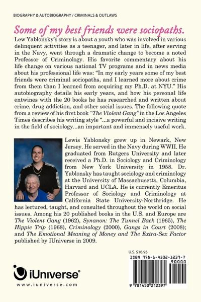 Lew Yablonsky's story is about a youth who was involved in various delinquent activities as a teenager, and later in life, after serving in the Navy, went through a dramatic change to become a noted Professor of Criminology. His favorite commentary about his life change on various national TV programs and in news media about his professional life was: "In my early years some of my best friends were criminal sociopaths, and I learned more about crime from them than I learned from acquiring my Ph.D. at NYU." His autobiography details his early years, and how his personal life entwines with the 20 books he has researched and written about crime, drug addiction, and other social issues. The following quote from a review of his first book "The Violent Gang" in the Los Angeles Times describes his writing style "...a powerful and incisive writing in the field of sociology...an important and imensely useful work.