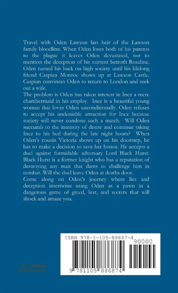Travel with Oden Lawson last heir of the Lawson family bloodline. When Oden loses both of his parents to the plague it leaves Oden devastated, not to mention the deception of his current betroth Rosaline. Oden turned his back on high society until his lifelong friend Caspian Monroe shows up at Lawson Castle. Caspian convinces Oden to return to London and seek out a wife. The problem is Oden has taken interest in Inez a mere chambermaid in his employ. Inez is a beautiful young woman that loves Oden unconditionally. Oden refuses to accept his undeniable attraction for Inez because society will never condone such a match. Will Oden succumb to the intensity of desire and continue taking Inez to his bed during the late night hours? When Oden's cousin Victoria shows up on his doorstep, he has to make a decision to save her honor. He accepts a duel against formidable adversary Lord Black Hurst. Black Hurst is a former knight who has a reputation of destroying any man that dares to challenge him in combat.