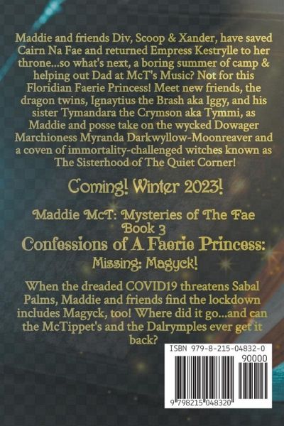 Maddie and friends Div, Scoop & Xander, have saved Cairn Na Fae and returned Empress Kestrylle to her throne...so what's next, a boring summer of camp & helping out Dad at McT's Music? Not for this Floridian Faerie Princess! Meet new friends, the dragon twins, Ignaytius the Brash aka Iggy, and his sister Tymandara the Crymson aka Tymmi, as Maddie and posse take on the wycked Dowager Marchioness Myranda Darkwyllow-Moonreaver and a coven of immortality-challenged witches known as The Sisterhood of The Quiet Corner!