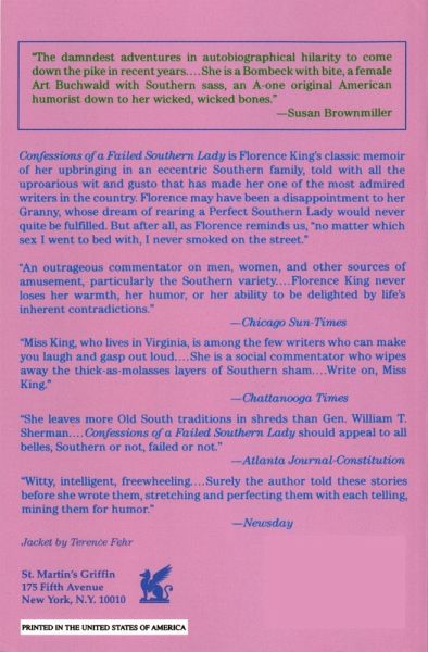 Confessions of a Failed Southern Lady is Florence King's classic memoir of her upbringing in an eccentric Southern family, told with all the uproarious wit and gusto that has made her one of the most admired writers in the country. Florence may have been a disappointment to her Granny, whose dream of rearing a Perfect Southern Lady would never be quite fulfilled. But after all, as Florence reminds us, "no matter which sex I went to bed with, I never smoked on the street."