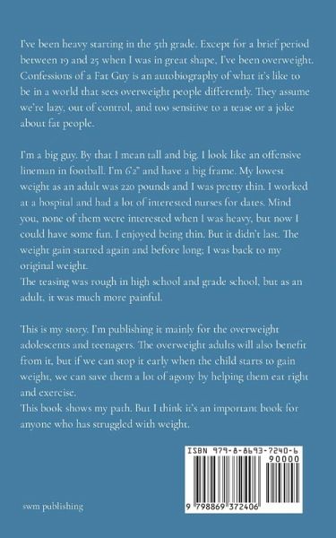 I've been heavy starting in the 5th grade. Except for a brief period between 19 and 25 when I was in great shape, I've been overweight. Confessions of a Fat Guy is an autobiography of what it's like to be in a world that sees overweight people differently. They assume we're lazy, out of control, and too sensitive to a tease or a joke about fat people. I'm a big guy. By that I mean tall and big. I look like an offensive lineman in football. I'm 6'2" and have a big frame. My lowest weight as an adult was 220 pounds and I was pretty thin. I worked at a hospital and had a lot of interested nurses for dates. Mind you, none of them were interested when I was heavy, but now I could have some fun. I enjoyed being thin. But it didn't last. The weight gain started again and before long; I was back to my original weight. The teasing was rough in high school and grade school, but as an adult, it was much more painful. This is my story. I'm publishing it mainly for overweight adolescents and teenagers. The overweight adults will also benefit from it, but if we can stop it early when the child starts to gain weight, we can save them a lot of agony by helping them eat right and exercise. This will become a huge health issue in the near future. All of these obese children and adolescents will grow into adults with significant health problems like diabetes in there 20s and 30s. This book shows my path. But I think it's an important book for anyone who has struggled with weight.