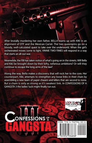 After brutally murdering her own father, BELLA teams up with KIKI in an alignment of OTF and the Mexican Cartel. The two queenpins go on a bloody, well-calculated quest to take over the underworld. When the girl's orchestrated moves come to light, VINNIE TWO-TIMES will respond in a way that starts an all-out war. Meanwhile, the FBI has taken notice of what's going on in the streets. Will Bella and Kiki be brought down by their lofty, nefarious ambitions? Or will they continue to escape the long arms of the law? Along the way, Bella makes a discovery that will rock her to the core. Her counterpart, Kiki, attempts to strengthen any loose links in their chain by assembling a new team of paper chasers and killers that are second to none. But a chain is only as strong as it's weakest link. In CONFESSIONS OF A GANGSTA 3 the ladies' luck might finally run out.