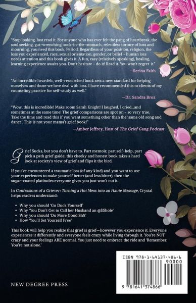 Grief sucks, but you don't have to. Part memoir, part self-help, part choose your own grief guide; this cheeky and honest book takes a hard look at society's view of grief and flips it the bird. If you've encountered a traumatic loss (of any kind) and you want to use your experiences to make yourself better (and less bitter), then the sugar-coated platitudes everyone gives you just won't cut it. In Confessions of a Griever: Turning a Hot Mess into an Haute Message, Crystal helps readers understand: Why you should 'Go Duck Yourself' Why 'You Don't Get to Call her Husband an @$$hole' Why you should 'Do More Good Sh!t' How 'You'll Set Yourself Free' This book will help you realize that grief is grief-however you experience it. Everyone experiences it differently and everyone feels crazy while living through it. You're NOT crazy and your feelings ARE normal. You just need to embrace the ride and 'Remember. You're not alone.'