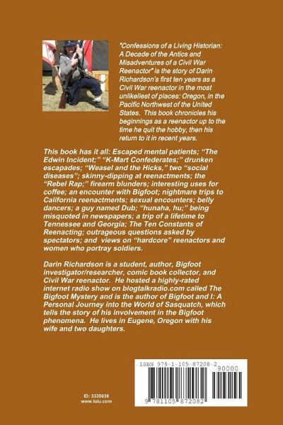 "Confessions of a Living Historian: A Decade of the Antics and Misadventures of a Civil War Reenactor" is the story of Darin Richardson's first ten years as a Civil War reenactor in the most unlikeliest of places: Oregon, in the Pacific Northwest of the United States. This book chronicles his beginnings as a reenactor up to the time he quit the hobby, then his return to it in recent years. This book has it all: Escaped mental patients; "The Edwin Incident;" "K-Mart Confederates;" drunken escapades; "Weasel and the Hicks," two "social diseases"; skinny-dipping at reenactments; the "Rebel Rap;" firearm blunders; interesting uses for coffee; an encounter with Bigfoot; nightmare trips to California reenactments; sexual encounters; belly dancers; a guy named Dub; "hunaha, hu;" being misquoted in newspapers; a trip of a lifetime to Tennessee and Georgia; The Ten Constants of Reenacting; outrageous questions asked by spectators, and views on "hardcore" reenactors and women who portray soldiers.