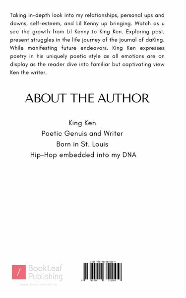 Taking in-depth look into my relationships, personal ups and downs, self-esteem, and Lil Kenny up bringing. Watch as u see the growth from Lil Kenny to King Ken. Exploring past, present struggles in the life journey of the journal of daKing. While manifesting future endeavors. King Ken expresses poetry in his uniquely poetic style as all emotions are on display as the reader dive into familiar but captivating view Ken the writer.