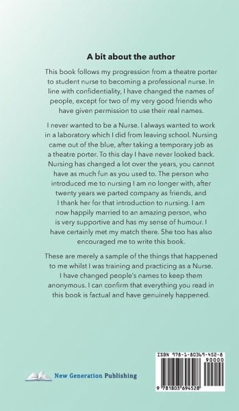 A bit about the author This book follows my progression from a theatre porter to student nurse to becoming a professional nurse. In line with confidentiality, I have changed the names of people, except for two of my very good friends who have given permission to use their real names. I never wanted to be a Nurse. I always wanted to work in a laboratory which I did from leaving school. Nursing came out of the blue, after taking a temporary job as a theatre porter. To this day I have never looked back. Nursing has changed a lot over the years, you cannot have as much fun as you used to. The person who introduced me to nursing I am no longer with, after twenty years we parted company as friends, and I thank her for that introduction to nursing. I am now happily married to an amazing person, who is very supportive and has my sense of humour. I have certainly met my match there. She too has also encouraged me to write this book. ¿These are merely a sample of the things that happened to me whilst I was training and practicing as a Nurse. I have changed people's names to keep them anonymous. I can confirm that everything you read in this book is factual and have genuinely happened.