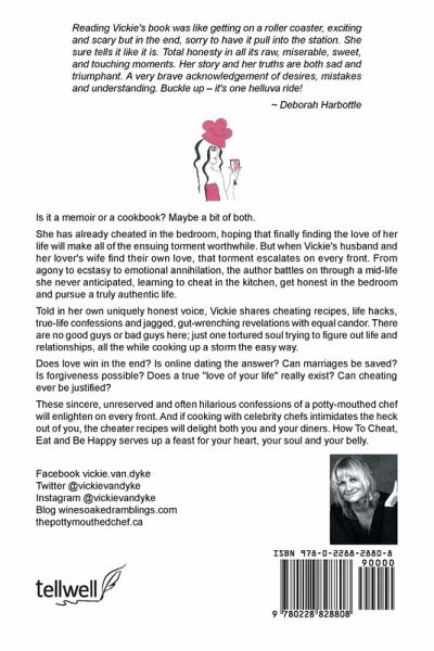 Reading Vickie's book was like getting on a roller coaster, exciting and scary but in the end, sorry to have it pull into the station. She sure tells it like it is. Total honesty in all its raw, miserable, sweet, and touching moments. Her story and her truths are both sad and triumphant. A very brave acknowledgement of desires, mistakes and understanding. Buckle up - it's one helluva ride! ~ Deborah Harbottle Is it a memoir or a cookbook? Maybe a bit of both. She has already cheated in the bedroom, hoping that finally finding the love of her life will make all of the ensuing torment worthwhile. But when Vickie's husband and her lover's wife find their own love, that torment escalates on every front. From agony to ecstasy to emotional annihilation, the author battles on through a mid-life she never anticipated, learning to cheat in the kitchen, get honest in the bedroom and pursue a truly authentic life. Told in her own uniquely honest voice, Vickie shares cheating recipes, life hacks, true-life confessions and jagged, gut-wrenching revelations with equal candor. There are no good guys or bad guys here; just one tortured soul trying to figure out life and relationships, all the while cooking up a storm the easy way. Does love win in the end? Is online dating the answer? Can marriages be saved? Is forgiveness possible? Does a true "love of your life" really exist? Can cheating ever be justified? These sincere, unreserved and often hilarious confessions of a potty-mouthed chef will enlighten on every front. And if cooking with celebrity chefs intimidates the heck out of you, the cheater recipes will delight both you and your diners. How To Cheat, Eat and Be Happy serves up a feast for your heart, your soul and your belly. Facebook vickie.van.dyke Twitter @vickievandyke Instagram @vickievandyke Blog winesoakedramblings.com