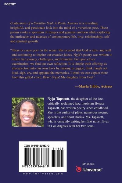 Confessions of a Sensitive Soul: A Poetic Journey is a revealing, insightful, and passionate look into the mind of a voracious poet. These poems evoke a spectrum of images and genuine emotion while exploring the intricacies and nuances of contemporary life, love, relationships, self and spiritual growth. 'There is a new poet on the scene! Proof that God is alive and well and continuing to inspire our creative juices. Nyja's poetry was written to reflect her journey, challenges and triumphs; but upon closer examination we find our own reflection. It is simple truth offering us introspection into our own lives by making us giggle, think, laugh out loud, sigh, cry, and applaud the memories. I think we can expect more from this gifted voice. Bravo Nyja! My daughter from God." -Marla Gibbs, Actress