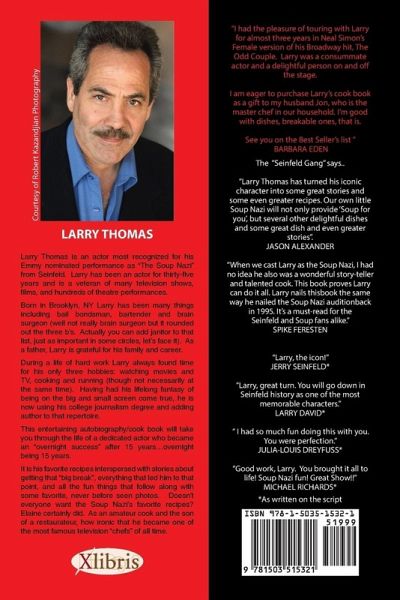 "...So it was finally here - shoot night! The bleachers were full and from what I heard, mostly important industry people. I must admit waiting for my first scene after the cameras were rolling on the first Jerry's-living-room scene made me a little nervous. Sure I'd been acting for quite a few years and in every different situation. I'd done theater where set pieces have fallen in front of an audience, actors not showing up for an entrance in front of an audience, improv comedy in front of an audience where anything could happen, and film where the close-up is all powerful. The close-up on film is very exciting as everyone has already done their work to get to that moment. So if it's your close-up, you can make or break everyone else's work. It's up to you. If you nail it, you're everyone's hero. If you blow it, there is more work for all. But still, I was a little nervous. This was Seinfeld after all, the hottest show on TV. When it was time for us to move into the soup kitchen for my first scene and I took my place behind the counter, the thought struck me, with four film cameras rolling-if I blew a take, would it not cost more than they were paying me? That kind of blew my mind. (Okay, I grew up in the sixties)... ...And then came the awful sound that you shouldn't hear until the scene is over, and you know you nailed it. "Cut!" My stomach knotted. "Was it something I did?" Read Confessions of a Soup Nazi; An Adventure in Acting and Cooking for this and many other stories and the recipes that follow. Every story has a recipe and every recipe has a story.