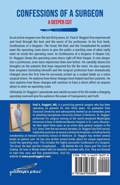 As an active surgeon over the last thirty years, Dr. Paul A. Ruggieri has experienced and lived through the best and the worst of his profession. In his first book, Confessions of a Surgeon: The Good, the Bad, and the Complicated he pushed open the operating room doors to give the public a startling view of what really went on inside the operating room. In Confessions of a Surgeon: A Deeper Cut, Dr. Ruggieri blows the operating room doors right off their hinges. It cuts deeper into a profession, even more mysterious then ever before. He candidly shares his thoughts on the patients that have impacted his life the most. He also exposes how surgeons (including himself) and the surgical profession have dramatically changed since the first time he nervously picked up a scalpel blade as a naïve surgical intern. He explores how these changes have helped and hurt patients. He also explores how these changes will continue to have a direct affect on anyone about to enter an operating room. Ultimately, Dr. Ruggieri's passionate and candid account of his life inside a changing operating room will give his audience the power of transparency and truth.