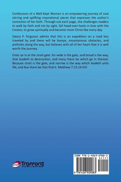 Confessions of a Well-Kept Woman is an empowering journey of soul stirring and uplifting inspirational pieces that expresses the author's conviction of her faith. Through out each page, she challenges readers to walk by faith and not by sight, fall head-over-heels in love with the Creator, to grow spiritually and become more Christ-like every day. Satara P. Ferguson admits that this is an expedition on a road less traveled by and there will be bumps, mountainous obstacles, and potholes along the way, but believes with all of her heart that it is well worth the journey. Enter ye in at the strait gate: for wide is the gate, and broad is the way, that leadeth to destruction, and many there be which go in thereat: Because strait is the gate, and narrow is the way which leadeth unto life, and few there be that find it. Matthew 7:13-14 KJV