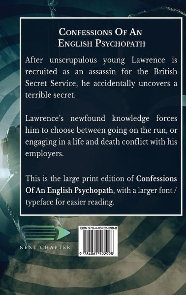 After unscrupulous young Lawrence is recruited as an assassin for the British Secret Service, he accidentally uncovers a terrible secret. Lawrence's newfound knowledge forces him to choose between going on the run, or engaging in a life and death conflict with his employers. This is the large print edition of Confessions Of An English Psychopath, with a larger font / typeface for easier reading.