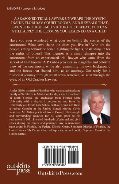 A seasoned trial lawyer unwraps the mystic inside Florida's court rooms, and reveals that, even through each victory or defeat, you can still apply the lessons you learned as a child! Have you ever wondered what goes on behind the scenes of the courtroom? What laws shape the cities you live in? Who are the people, sitting behind the bench, fighting the fights, or standing up for the rights of others? This memoir is a small glimpse into the courtroom, from an experienced trial lawyer who came from the school of hard knocks. A.P. Gibbs provides an insightful and colorful view of the courtroom, while also examining his own background and the forces that shaped him, as an attorney. Get ready for a historical journey through small town America, as seen through the eyes, of an Old Cracker Lawyer. Ander Gibbs is a native Floridian who was raised in a large family of 9 children in Madison Florida, a small rural town in north Florida. He graduated from Florida State University with a degree in accounting and from the University of Florida Law School with a J D in Law. He is a retired Captain in the United Stated Marine Corps Reserves. Mr. Gibbs practiced law in Pasco, Hillsborough, and surrounding counties for 43 years prior to his retirement in 2011. He tried hundreds of criminal and civil cases during his career and practiced law in numerous state courts in Florida, the Federal District Court, Southern District of Florida, the United States 5th Circuit Court of Appeals, as well as the Supreme Court of the United States.