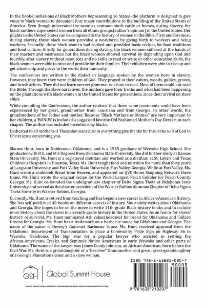 In the book-Confessions of Black Mothers Representing 16 States -the platform is designed to give voice to black women to document four major contributions to the building of the United States of America. Even though mistreated the same as common stock cattle or horses, during slavery, the black mothers superseded women from all ethnic groups(author's opinion) in the United States. Her plights in the United States can be compared to the history of women in the Bible. First and foremost, during slavery, these black women provided a workforce, by giving birth to workers and being workers; Secondly -these black women had cooked and provided basic recipes for food traditions and food culture; thirdly, for generations during slavery, the black women suffered at the hands of their masters and mistresses but the black women showed survival by depending upon God and fourthly, after slavery without resources and no skills to read or write or other education skills, the black women were able to raise and provide for their families. Their children were able to rise up and get citizenship and prove to the world their humanity. The confessions are written in the dialect or language spoken by the women born in slavery. However, they knew they were children of God. They prayed in their cabins, woods, gullies, groves, and brush arbors. They did not learn correct grammar nor how to read. Most of them could not read the Bible. Through the slave narratives, the mothers gave their truths and what had been happening on the plantations with black women in the United States for generations, since their arrival on slave ships. While compiling the Confessions, the author realized that these same treatments could have been experienced by her great, grandmother from Louisiana and from Georgia. In other words, the grandmothers of her father and mother. Because "Black Mothers or Mamas" are very important to her children, a 'BONUS' is included a suggested favorite Old Fashioned Mother's Day Dessert in each chapter. The author has included inventions by blacks. Dedicated to all mothers-II Thessaloninans2:18 In everything give thanks for this is the will of God in Christ Jesus concerning you.