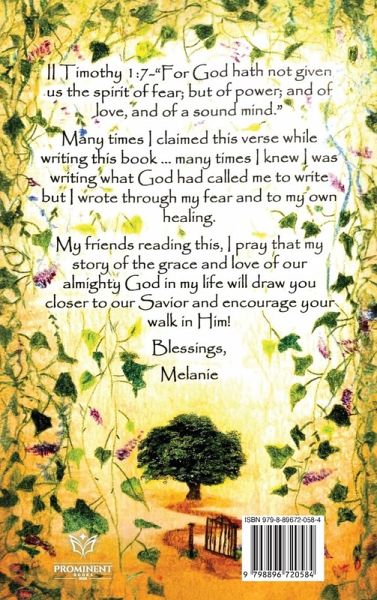 11 Timothy 1:7- "For God hath not given us the spirit of fear; but of power; and of love, and of sound mind." Many times I claimed this verse while writing this book...many times I knew I was writing what God had called me to write but I wrote through my fear and to my own healing. My friends reading this, I pray that my story of the grace and love of our almighty God in my life will draw you closer to our Savior and encourage your walk in Him! Blessings, Melanie