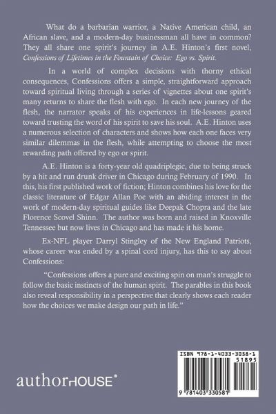What do a barbarian warrior, a Native American child, an African slave, and a modern-day businessman all have in common? They all share one spirit’s journey in A.E. Hinton’s first novel, Confessions of Lifetimes in the Fountain of Choice: Ego vs. Spirit. In a world of complex decisions with thorny ethical consequences, Confessions offers a simple, straightforward approach toward spiritual living through a series of vignettes about one spirit’s many returns to share the flesh with ego. In each new journey of the flesh, the narrator speaks of his experiences in life-lessons geared toward trusting the word of his spirit to save his soul. A.E. Hinton uses a numerous selection of characters and shows how each one faces very similar dilemmas in the flesh, while attempting to choose the most rewarding path offered by ego or spirit. A.E. Hinton is a forty-year old quadriplegic, due to being struck by a hit and run drunk driver in Chicago during February of 1990. In this, his first published work of fiction; Hinton combines his love for the classic literature of Edgar Allan Poe with an abiding interest in the work of modern-day spiritual guides like Deepak Chopra and the late Florence Scovel Shinn. The author was born and raised in Knoxville Tennessee but now lives in Chicago and has made it his home. Ex-NFL player Darryl Stingley of the New England Patriots, whose career was ended by a spinal cord injury, has this to say about Confessions: "Confessions offers a pure and exciting spin on man’s struggle to follow the basic instincts of the human spirit. The parables in this book also reveal responsibility in a perspective that clearly shows each reader how the choices we make design our path in life."