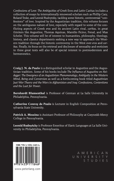 Confessions of Love: The Ambiguities of Greek 'Eros' and Latin 'Caritas' includes a collection of essays by internationally renowned scholars such as Phillip Cary, Roland Teske, and Leonid Rudnytzky, tackling some historic, controversial «confessions» of love. Inspired by the Augustinian tradition, this volume focuses on the ambiguous nature of love, especially with regard to some of the conflicting aspects of Greek eros and its ancient Latin rival, caritas, in great thinkers like Augustine, Thomas Aquinas, Marsilio Ficino, Freud, and Max Scheler. This volume will be of interest to humanities, philosophy, theology, history, and classics departments seeking a new way to approach the Western tradition through the historic controversy in the West over eros and caritas. Finally, its focus on the retrieval and disclosure of sensuality and eroticism in these great texts will also be of special interest to postmodernism and hermeneutics.