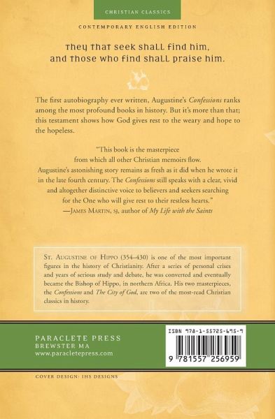 The first autobiography ever written, and one of the most profound testaments of faith, ever. "This book is the masterpiece from which all other Christian memoirs flow. Augustine's astonishing story remains as fresh as it did when he wrote it in the late fourth century. The Confessions still speaks with a clear, vivid and altogether distinctive voice to believers and seekers searching for the One who will give rest to their restless hearts." --James Martin, SJ, author of My Life with the Saints